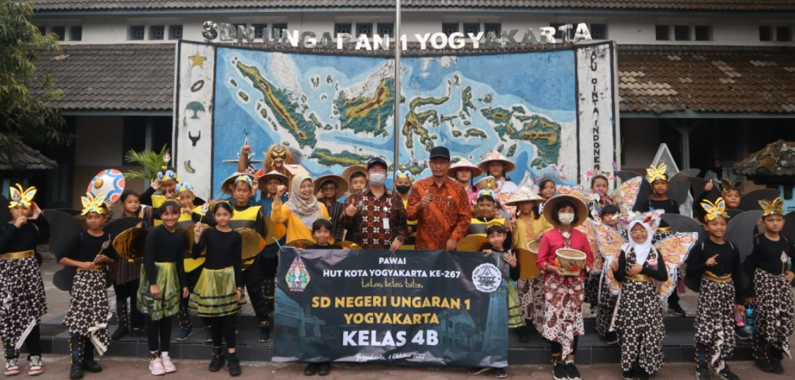YOGYAKARTA , SNEUSA SD Negeri Ungaran 1 Yogyakarta turut menyemarakkan Hari Ulang Tahun (HUT) ke-267 Kota Yogyakarta dengan menggelar pawai yang di ikuti oleh 684 siswa dan siswi, 60 guru karyawan, 96 FOS atau Forum Orang tua Siswa,11 PPL dan 6 orang guru magang dari Sumba Tengah, total jumlah 837 peserta , Rabu (4/10/2023).